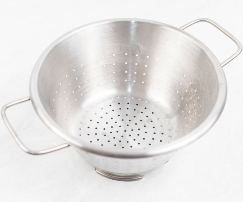 What does a warning label on a large strainer say?
